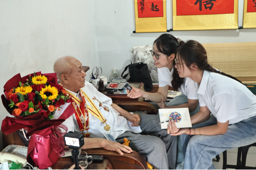 此外,实践团走访慰问多名老兵,向为民族解放事业立下不朽功勋的老兵致以崇高敬意和深切关怀;实践团前往武警某中队开展交流学习活动,与三名武警官兵进行座谈,共话抗战历史与家国情怀,近距离感受新时代武警官兵的忠诚与担当。实践团与官兵们共同录制寄语视频,青年学子的青春誓言与武警战士的坚守在国境线上交汇,传递出“强国有我”的共同信念。
