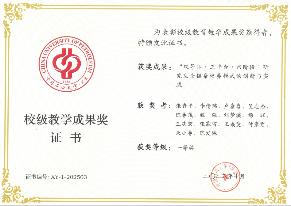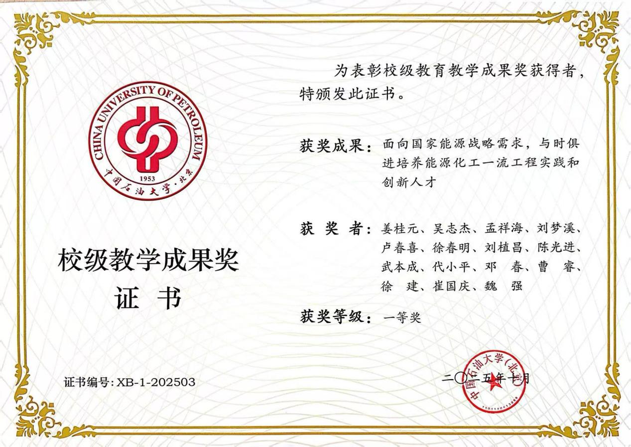 由徐春明院士负责,孟祥海、商辉教授等共同完成的“国家战略需求导向的石油加工系列课程建设与实践”获校级教学成果奖特等奖;由姜桂元负责,吴志杰、孟祥海、刘梦溪等共同完成的“面向国家能源战略需求,与时俱进培养能源化工一流工程实践和创新人才”获校级教学成果奖一等奖,张香平、李倩玮、卢春喜等共同完成的“‘双导师·三平台·四阶段’研究生全链条培养模式的创新与实践”获校级教学成果奖一等奖。