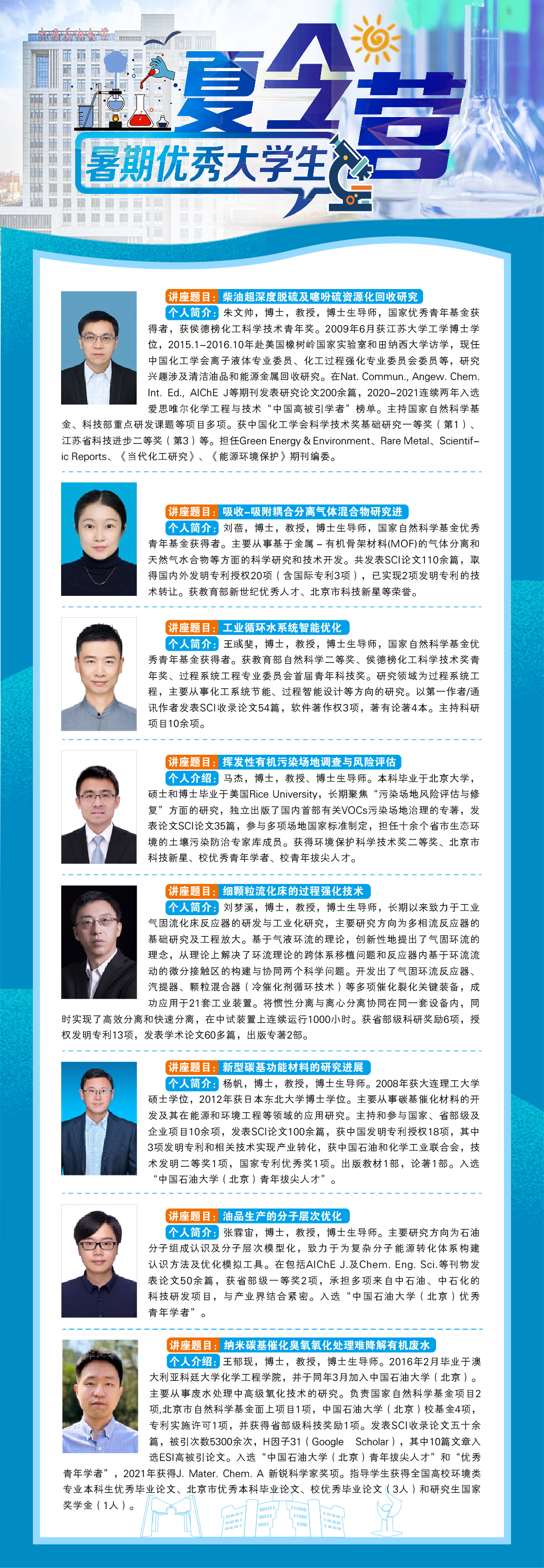 为了促进全国高校化学、化工、环境相关专业优秀本科生更好地了解中国石油大学(北京)化学工程与环境学院,推进有意深造读研学生与知名教授之间交流,学院将于2022年7月16至7月17日、8月13至8月14日分别举办两期优秀大学生暑期夏令营活动。此次夏令营将通过腾讯会议线上进行交流、学习、培训。