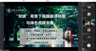 2022年秋季学期,中石大重磅推出“石油工程导论——名家讲坛”课程,李根生以“双碳背景下我国能源转型与绿色低碳发展”为主题为石油工程学院大一新生云端授课,鼓励学生着眼国家能源安全战略,肩负起能源报国、能源强国的使命。