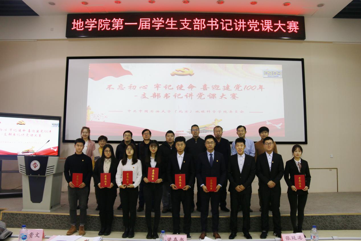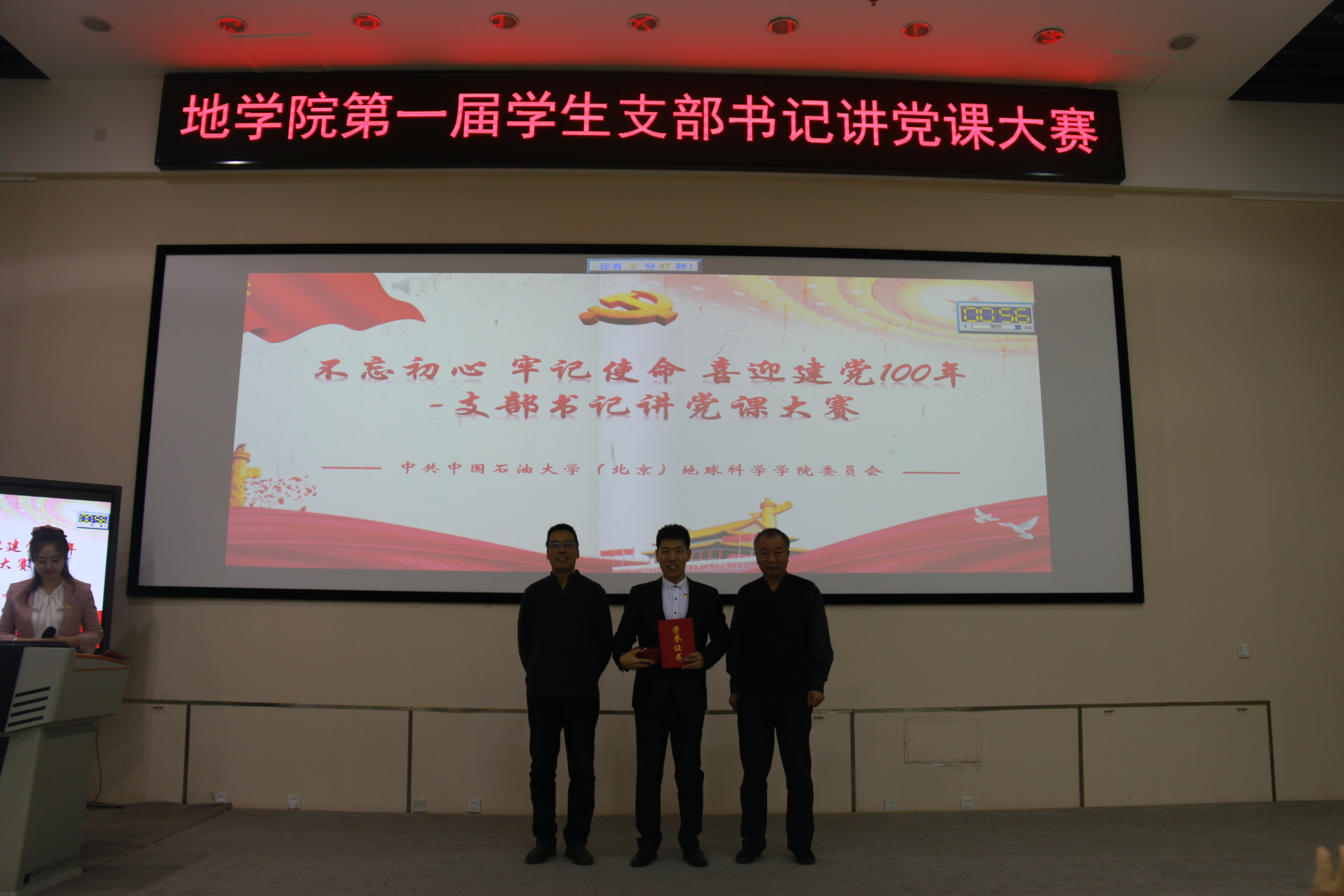 为深入学习党的十九届五中全会和习近平总书记给我校克拉玛依校区毕业生重要回信精神,进一步提升师生党员的党建理论水平和业务素质,12月10日下午,地球科学学院党委举办“不忘初心、牢记使命,喜迎建党一百年”第一届学生支部书记讲党课大赛。中国石油大学(北京)党委组织部部长梁喜书、党委宣传部副部长张延港、学生工作处副处长戴兵、地球科学学院党委书记王贵文、党委副书记周学智及各教工支部书记或支委参加大赛并担任评委,地学院90余名学生支部书记和委员现场观摩了比赛。