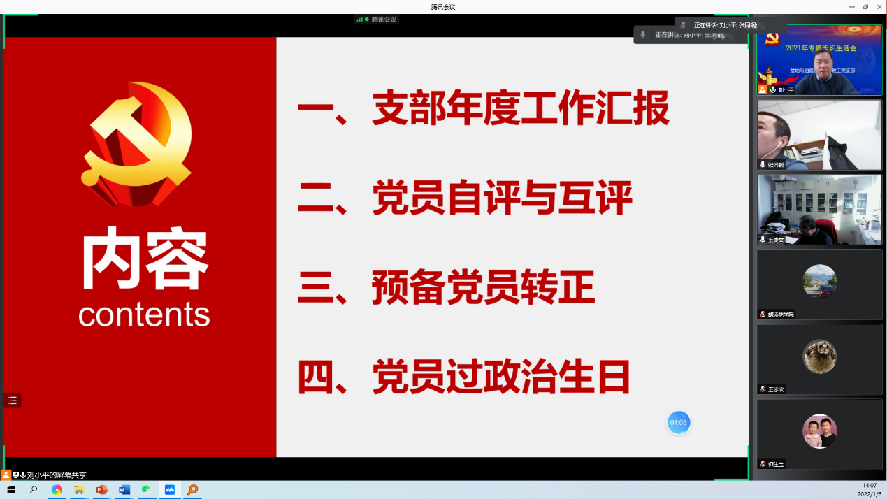 2022年1月6日下午,盆地与油藏研究中心教工党支部组织全体教职工线上进行了“2021年专题组织生活会”,共有32位党员和教职工参加了本次组织生活会,会议由刘小平同志主持,学院党委书记王贵文同志、学院副院长刘钰铭同志参加了会议,会议分为四个阶段。