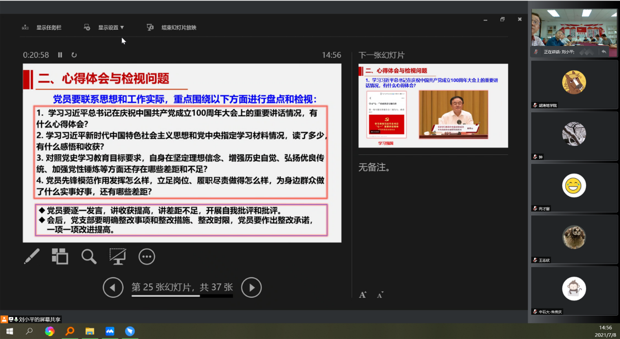 2021年7月8日下午,地球科学学院盆地与油藏研究中心教工党支部召开“学党史、悟思想、办实事、开新局”党史学习教育专题组织生活会,会议通过线下(在地质楼721党员活动室)和线上(腾讯会议)两种形式展开,支部共有26名党员参加了,其中3名正在辽宁兴城带本科生野外综合地质实习的教工党员线上参加。