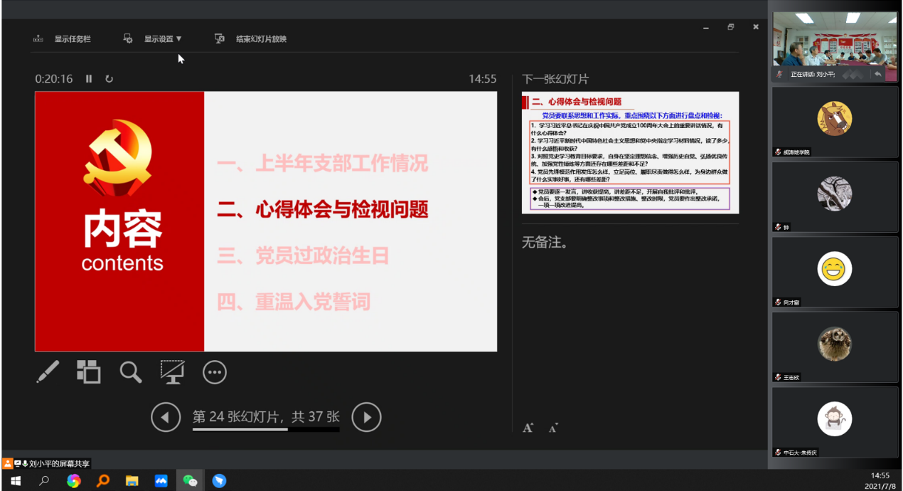 支部书记刘小平介绍了7月份学习要点,回顾了习近平总书记在庆祝中国共产党成立100周年大会上的重要讲话,强调了学习的必要性。学习分为四个部分:首先,刘小平系统汇报了2021年上半年支部工作情况,并对如何做好下步工作做了详尽的规划;其次,围绕“聆听习近平总书记在100周年大会上的重要讲话情况有什么心得体会”、“学习习近平新时代中国特色社会主义思想和党中央指定学习材料有什么感悟”、“对照党史学习教育目标要求中自身还存在哪些差距和不足”、“如何立足岗位、履职尽责发挥党员先锋模范作用”这四个方面,所有党员同志逐一发言,开展了自我批评。其中,刘小平首先带头展开了批评与自我批评,认为我们应该发挥共产党人的优良传统,吃水不忘挖井人,在做好自身本质工作的同时,要多加入到为身边群众做实事好事的工作中去,并介绍了支部朱雷同志积极参加社区工作为身边群众做好事的事例,鼓励同志们向朱雷学习;随后朱雷同志详细分享了为身边群众做好事的心路历程;朱传庆认为,学党史不是任务,更不是家庭作业,我们需要将党史学习融入到日常生活中,用心感悟才能领会精要;向才富认为我们处于和平盛世,应该努力将自身融入到国家建设中,在搞好科研工作的同时,更要为石油工业培养优秀人才。随后,刘小平主持为杨明慧、邱楠生、王洪玉3名党员过政治生日,并赠送了政治生日贺卡及生日礼物,最后,所有党员重温了入党誓词,进一步强化了政治仪式感。