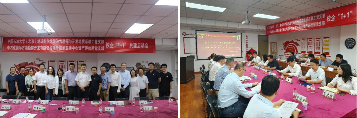 为深入学习贯彻党的二十大精神,在党建引领下,实现校企优势互补、深度融合、协同发展,9月8日下午,中石大地球科学学院油气勘探与开发地质系教工党支部联合中石化国际石油勘探开发有限公司(简称国勘公司)海外技术支持中心资产评价所党支部开展校企“ 1+1”党支部共建启动会。国勘公司副总经理赵煊、国勘公司副总师、海外技术支持中心党总支书记叶惠民、海外技术支持中心-资产评价所党支部书记那未红,地球科学学院党委书记姜福杰、副书记王茹、副院长刘钰铭、油气勘探与开发地质系教工党支部书记周勇、系主任李庆、盆地与油藏研究中心主任罗情勇及共建双方党支部党员代表等十余人参加本次支部共建启动会,会议由姜福杰主持。