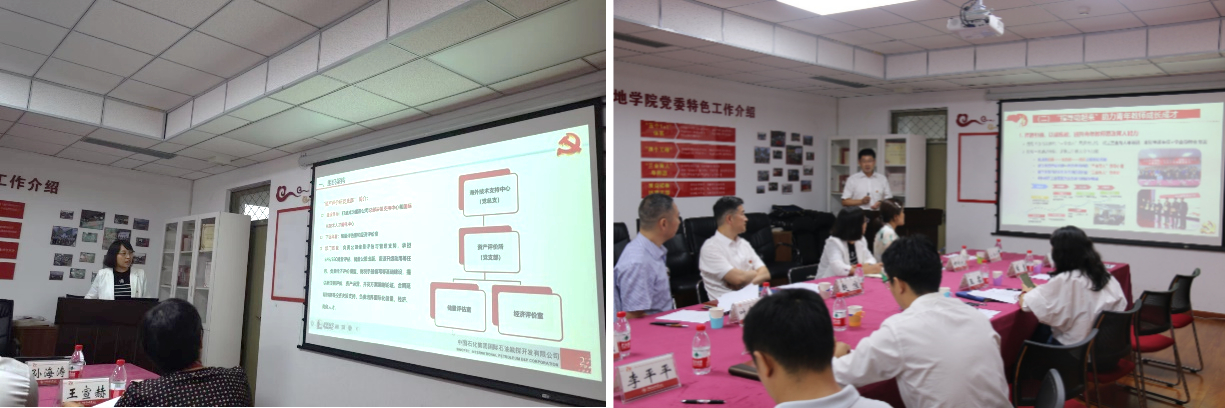 海外技术支持中心的资产评价所党支部书记那未红从支部组织架构、人员构成、部门职能、国际交流合作、党建工作及获得荣誉详细介绍了资源评价所支部情况。油气勘探与开发地质系教工党支部书记周勇以“坚守立德树人初心、勇担能源报国使命”为主题,介绍了支部情况,并提出了共建计划和预期成果——“培育优秀党建成果、建立完善合作育人机制、探索建立校企产学研合作模式、形成推广示范效应”。