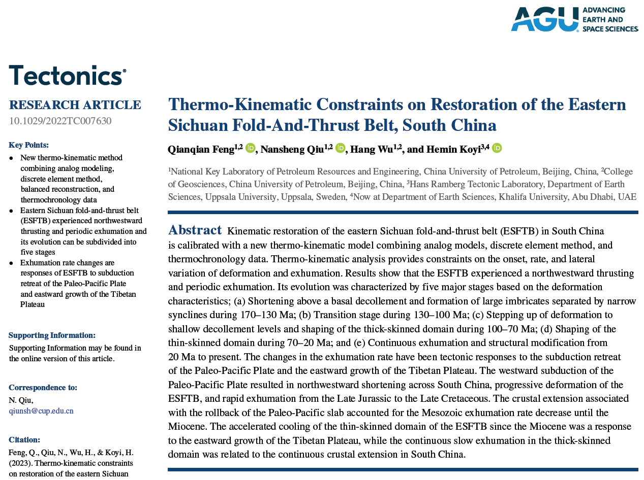 近日,我院优秀学科博士后冯乾乾在沉积盆地构造-热演化研究方面取得重要进展,和邱楠生教授、瑞典乌普萨拉大学Hans Ramberg构造实验室Hemin Koyi教授合作完成的研究成果《Thermo-Kinematic Constraints on Restoration of the Eastern Sichuan Fold-And-Thrust Belt, South China》发表在地学领域顶级期刊《Tectonics》上。论文通讯作者为邱楠生教授,中国石油大学(北京)油气资源与工程全国重点实验室和地球科学学院为第一完成单位。《Tectonics》是地球科学领域的一区TOP期刊,拥有重要的学术影响力,期刊重点出版地球岩石圈的演变,结构和变形相关的前沿科学报道。