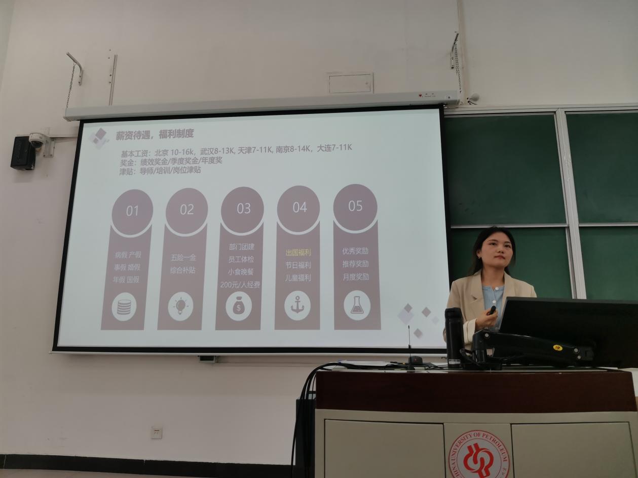 王凌月首先向同学们介绍了公司的发展历程和运营模式,接着从福利待遇、奖励机制、岗位优势、应聘流程、晋升通道等方面向大家做了详细介绍,并对同学们提出的问题进行了悉心解答。