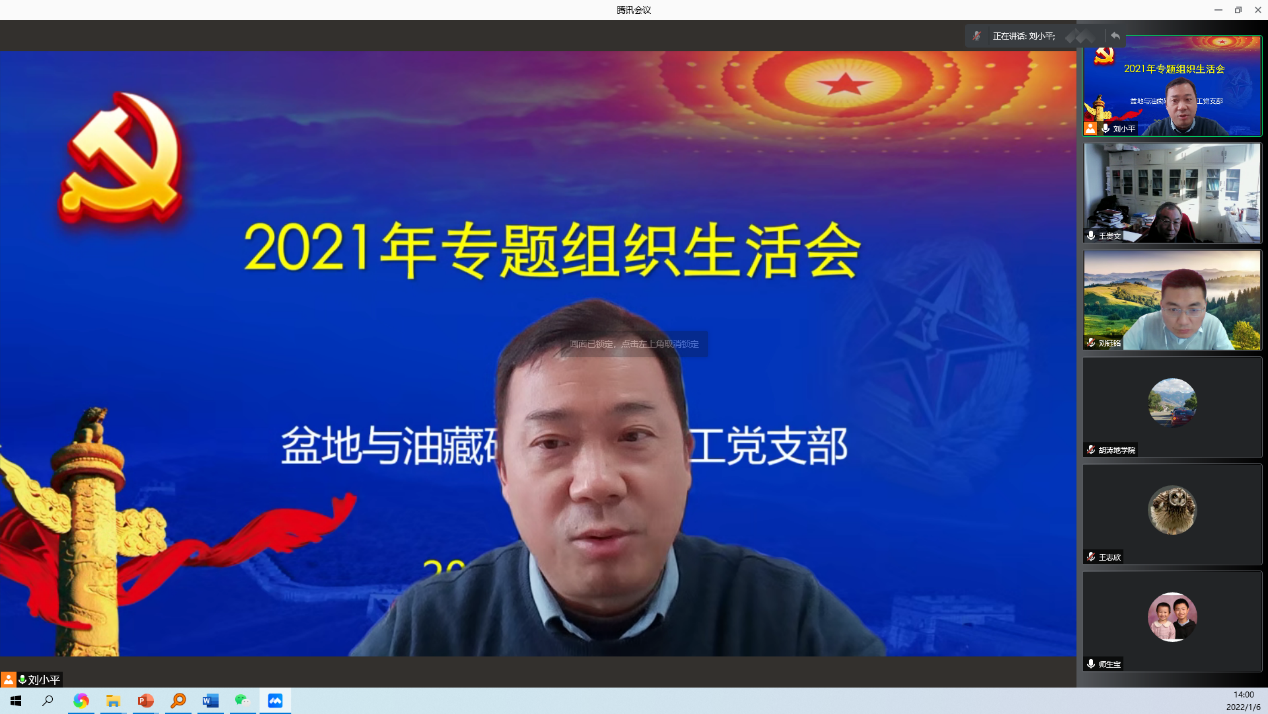 2022年1月6日下午,盆地与油藏研究中心教工党支部组织全体教职工线上进行了“2021年专题组织生活会”,共有32位党员和教职工参加了本次组织生活会,会议由刘小平同志主持,学院党委书记王贵文同志、学院副院长刘钰铭同志参加了会议,会议分为四个阶段。