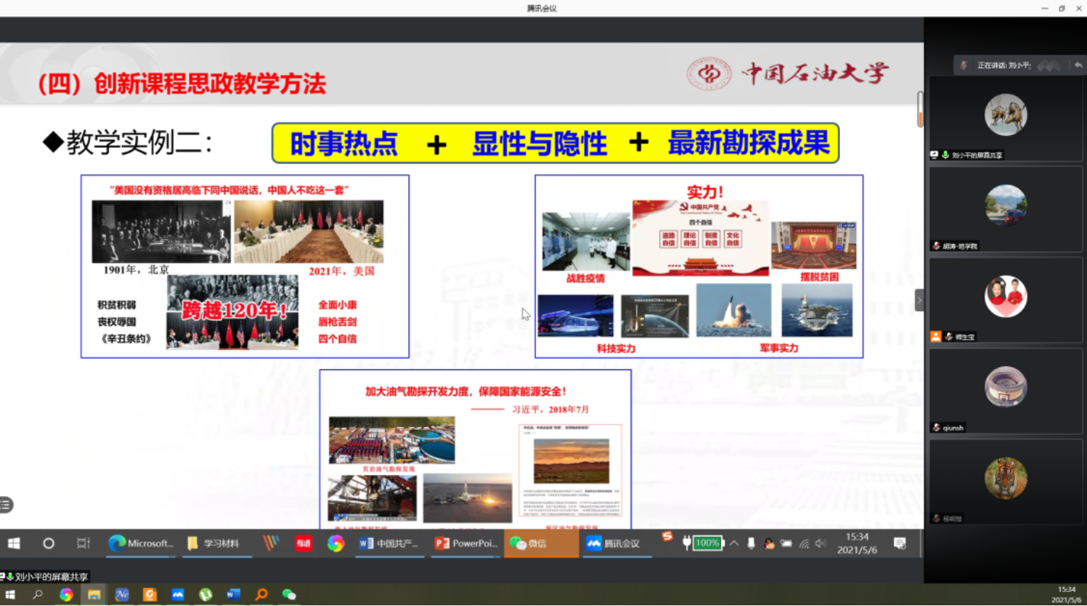 支部书记刘小平首先介绍了5月份学习要点,强调了学习的必要性。刘小平和师生宝分别深入浅出地介绍了中共中央印发《中国共产党普通高等学校基层组织工作条例》及答记者问,马勇和武晓光分别就《习近平出席领导人气候峰会并发表重要讲话》和《中国共产党简史》(第六章—第十章)开展了领学。李美俊主持为9名党员过政治生日,重温了入党誓词,强化了政治仪式感。白国平领学了教育部等八部门《关于加快构建高校思想政治工作体系的意见》,刘小平汇报了《油气田勘探》课程的思政建设情况,王广利、朱传庆等教师就“如何有效开展课程思政”积极发言交流。