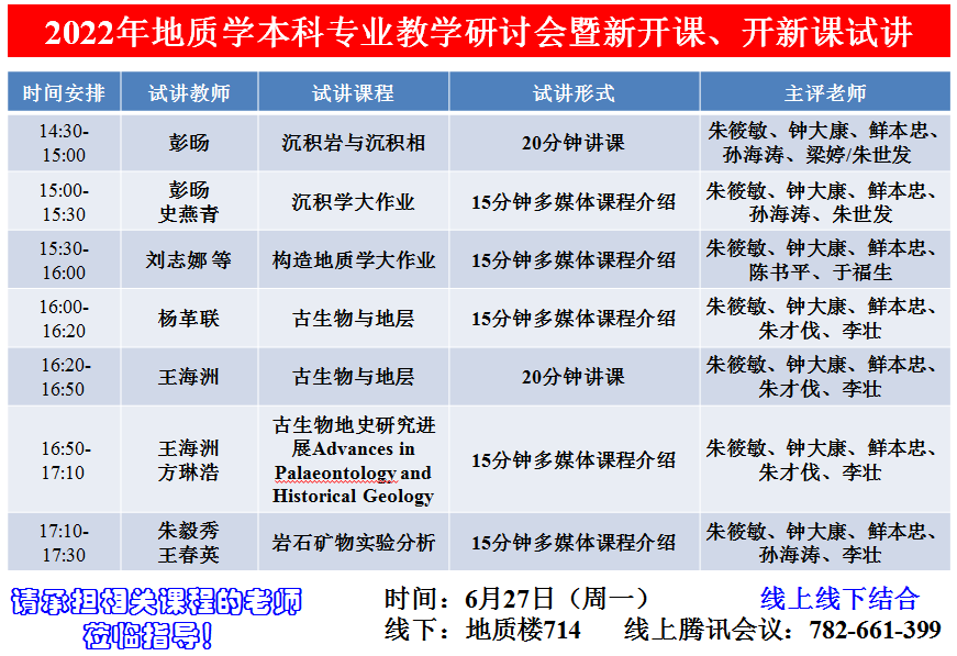 6月27日和30日下午,地质学系举办2022年地质学本科专业教学研讨会暨新开课、开新课试讲活动。院教学专家组成员朱筱敏、钟大康、鲜本忠、李壮以及相关教学团队成员包括陈书平、于福生、朱才伐、朱毅秀、孙海涛等23位老师线上或线下出席。