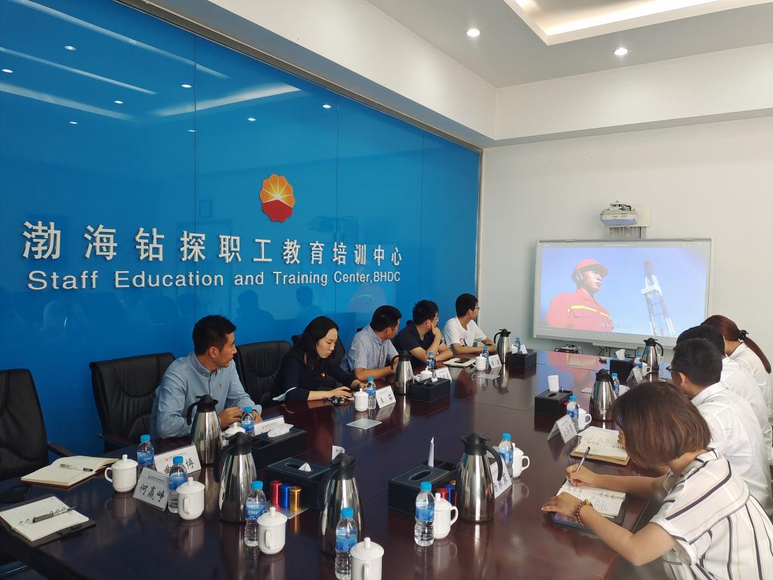 第三站来到渤海钻探职工教育培训中心,培训中心党委副书记刘永峰接待了王茹一行。刘永峰对王茹一行到访表示热烈欢迎。他指出,长期以来,渤海钻探职工教育培训中心与中国石油大学形成了稳定友好的合作关系和诚挚深厚的感情友谊。培训中心钻井基地党支部书记江泽邦结合基层党建工作实际,系统阐述了培训中心深入推进基层党建“三基本”建设与“三基”工作有机融合情况,通过实行党政同管、同抓、同责,极大的提高了培训中心的党建与政策实施的效率。“全国党建样板支部”——油气勘探与开发地质系教工党支部书记周勇从政治理论学习、人才培养、科学研究和社会服务四个方面,系统介绍了支部高质量党建引领高质量发展的具体做法和经验。双方就党建与业务如何融合、共促进行了深入交流和讨论。