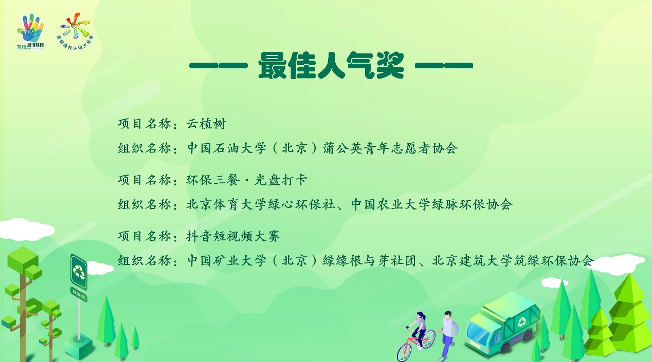 12月19日,第十七届首都高校环境文化季在北京市生态环境保护宣传中心完美落幕。在本届环境文化季中,中国石油大学(北京)蒲公英青年志愿者协会举办的“云植树”活动在12项环保实践活动中脱颖而出,荣获“最佳人气奖”。蒲公英青年志愿者协会成员胡深宇、岳文婧在50多所高校及环保社团的近万名参与者中荣获“首都高校环保卫士”称号,该奖项获得者仅有30人。