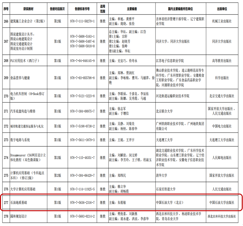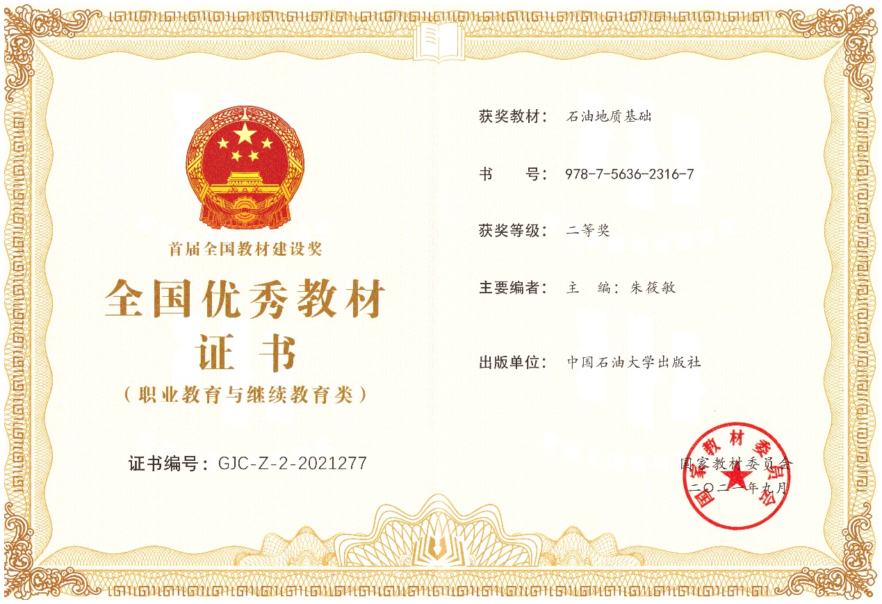 根据《国家教材委员会关于开展首届全国教材建设奖评选工作的通知》(国教材〔2020〕4号)要求,经过组织申报、初评推荐和国家评审等程序,2021年奖励首届全国优秀教材基础教育类200种、职业教育与继续教育类400种、高等教育类400种,全国教材建设先进集体100个,全国教材建设先进个人200名。近期,国家教材委员会发布《国家教材委员会关于首届全国教材建设奖奖励的决定》,由中国石油大学(北京)地球科学学院朱筱敏教授主编的《石油地质基础》教材荣获全国优秀教材(职业教育与继续教育类)二等奖。