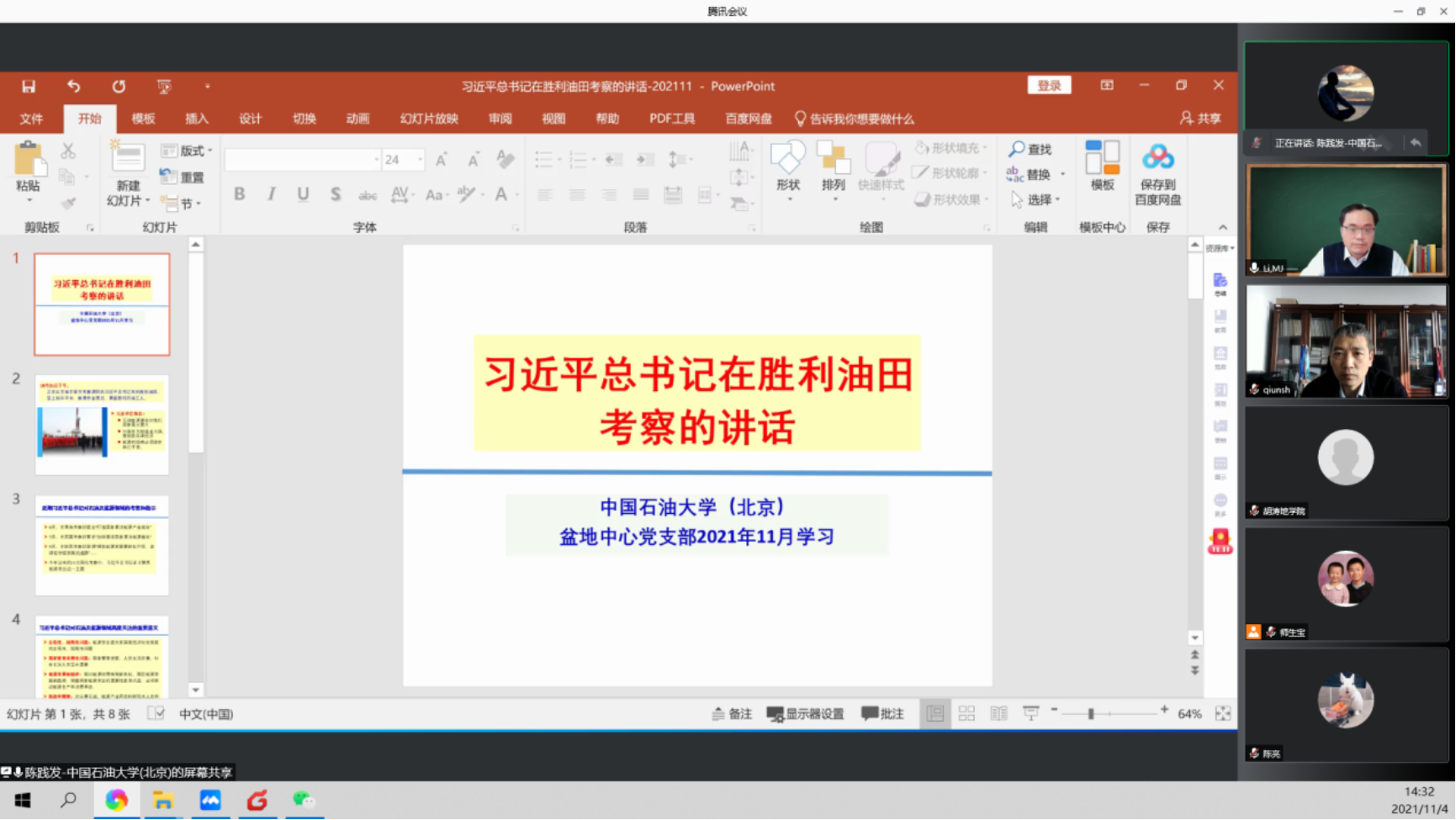 2021年11月4日下午,盆地与油藏研究中心教工党支部组织全体教职工线上进行了党员和教师理论学习,共有35位党员和教职工参加了本次学习和研讨,会议由李美俊同志主持,会议共分为三个阶段。