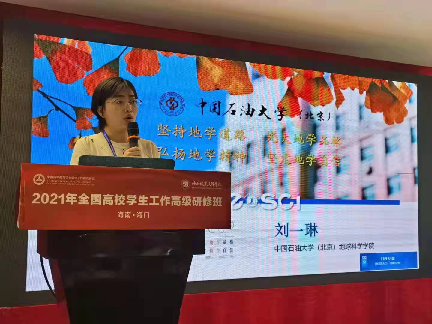 海南省教育厅党委委员、副厅长黎岳南,中国青年出版总社党委副书记、纪委书记、监事王剑,中国青年报新闻事业部副主任亓洪良,中国高等教育学会学生工作研究会副理事长、南京信息工程大学党委副书记、副校长王尧,中国高等教育学会学生工作研究分会秘书处单位、中北大学环境与安全工程学院党委副书记张少明,海南职业技术学院党委书记王承庆等同志出席开幕式。时代楷模、最美奋斗者、全国优秀教师、大连海事大学马克思主义学院教师曲建武教授等专家学者莅临开幕式。开幕式由海南省高校思想政治工作中青年骨干队伍建设项目负责人、海南职业技术学院校长助理、党委学工部部长许昌斌主持。我校地球科学学院辅导员高思航和刘一琳应邀参会,并在分论坛分别以“‘地学知识走进中小学课堂’的价值意蕴及启示”和“坚持深耕细作,推进‘三个融合’,构建大地之光立体育人新格局”做主题发言,介绍了我校“三全育人”综合改革试点建设中实践育人品牌“大地之光”和“李四光中队讲师团”,融合时代特征、专业特点、社会特需,深耕实践育人体系,着力培养有高度、有广度、有温度的时代新人,走出了一条可复制、可迁移、可持续的育人实践之路。