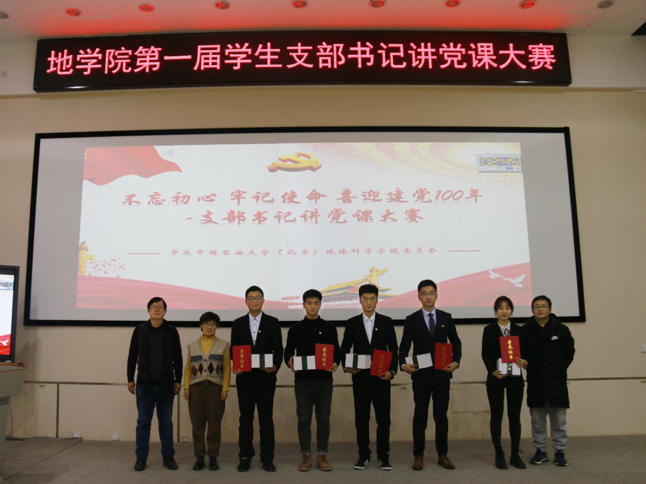 为深入学习党的十九届五中全会和习近平总书记给我校克拉玛依校区毕业生重要回信精神,进一步提升师生党员的党建理论水平和业务素质,12月10日下午,地球科学学院党委举办“不忘初心、牢记使命,喜迎建党一百年”第一届学生支部书记讲党课大赛。中国石油大学(北京)党委组织部部长梁喜书、党委宣传部副部长张延港、学生工作处副处长戴兵、地球科学学院党委书记王贵文、党委副书记周学智及各教工支部书记或支委参加大赛并担任评委,地学院90余名学生支部书记和委员现场观摩了比赛。