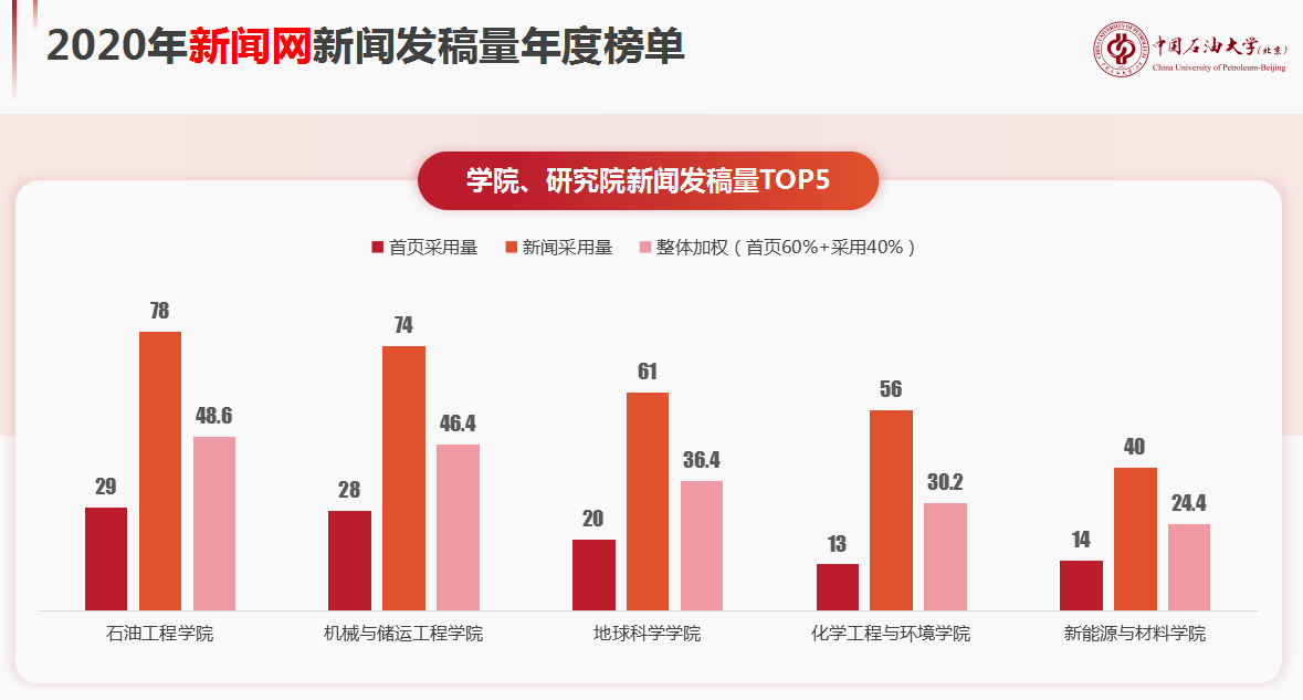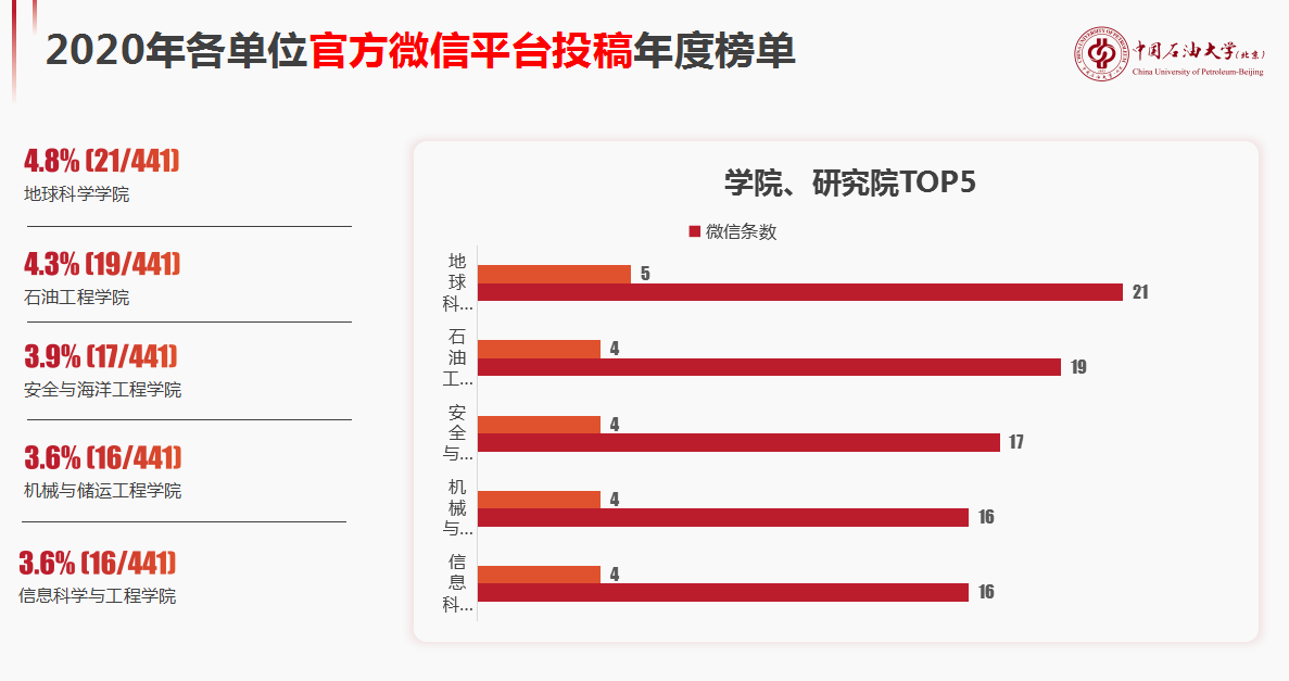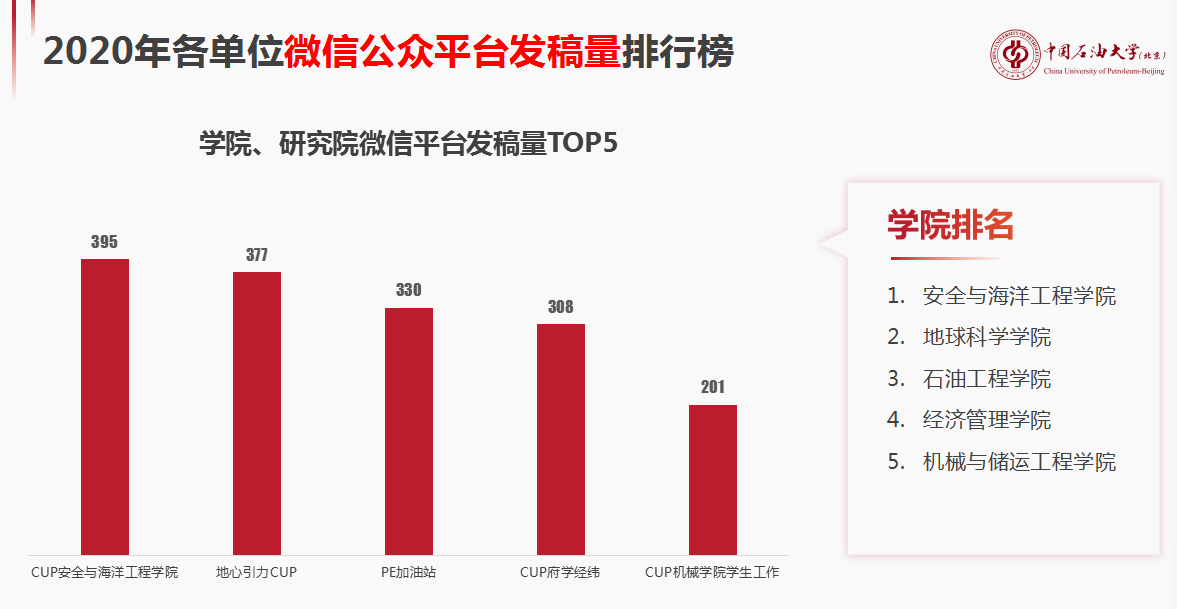 同时,党委宣传部负责人在表彰会上公布了2020年度新闻网新闻发稿年度榜单,官方微信平台发稿年度榜单,各单位官方微信平台投稿量排行榜、微信公众平台发稿量排行榜以及新媒体平台年度热文排行榜。我院年度新闻发稿量整体加权排名第三,向学校官方微信平台投稿量排名第一,学院微信公众平台“地心引力CUP”以377篇年度发稿量排名第二。