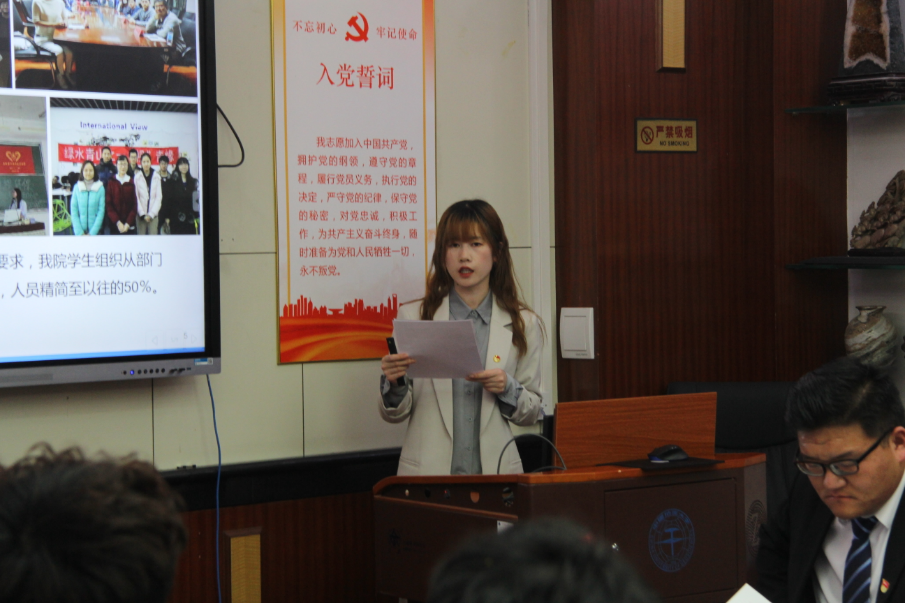 胡炎凤以《砥砺地学品格》为题向与会代表介绍了我院学生组织工作整体情况。报告以各学生组织深化改革取得的成果及相关品牌活动为切入点,重点突出了社团定期思想学习、石英计划团校、环保盒子等特色内容,受到了与会代表的一致好评。