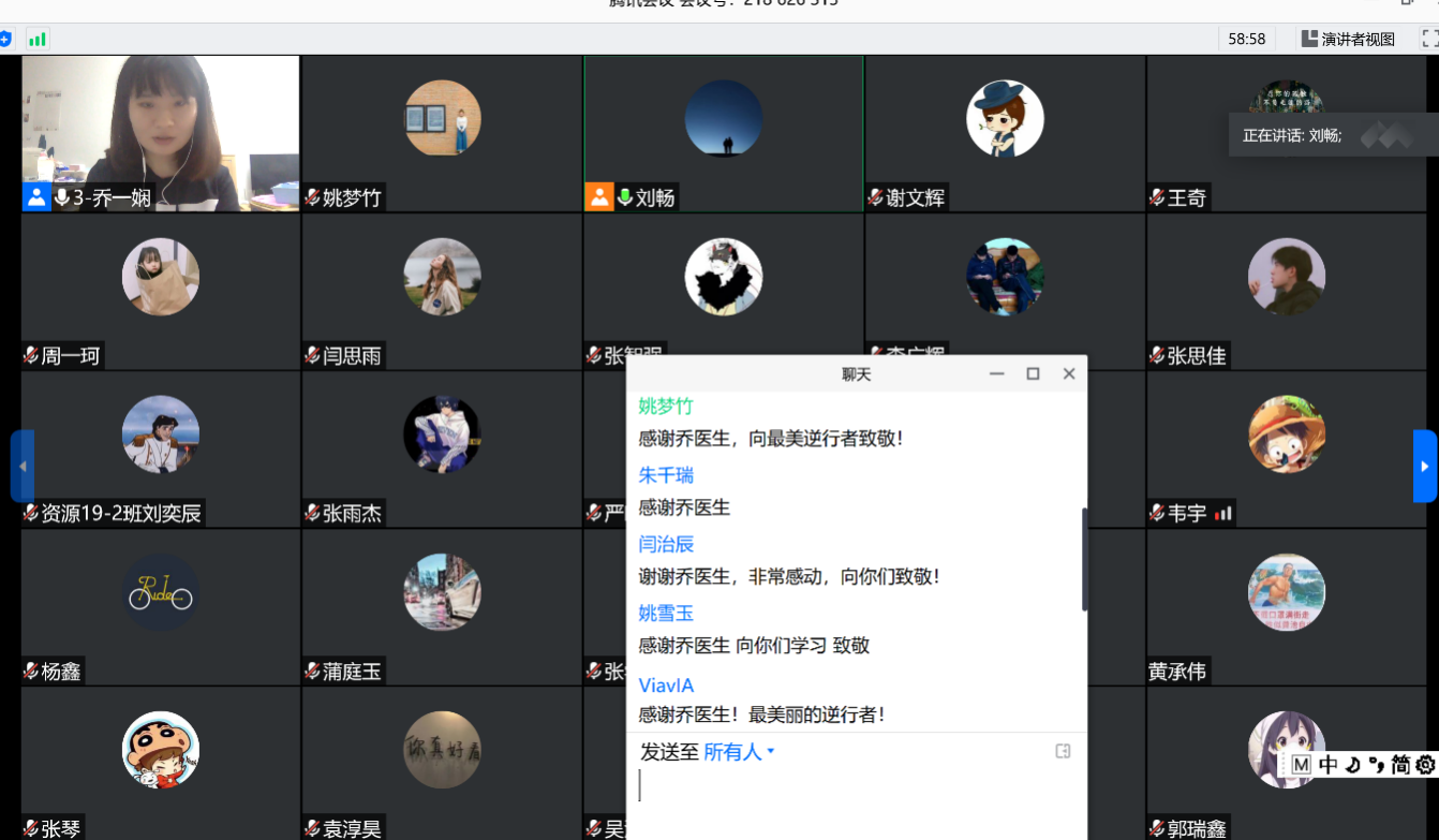 今天乔一娴医生分享的援鄂经历让我很感动,由于自己本科学校在武汉,平时经常路过她工作的地方和火神山医院附近,因此更加有一种身临其境的感觉。听完乔医生的分享,尤其是在讲到医疗队刚到武汉遇到的物资缺乏和气候不适应的难题的时候,心里的敬佩和感动更加深刻了。在国家和人民最需要他们的时候,毅然的放下了安逸和舒适,离开亲人和朋友,怀着最赤诚的心奔赴抗疫第一线,这种精神值得我们学习一生。