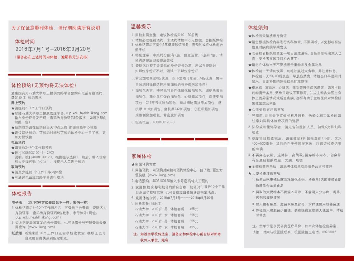 3.教职工必须在上述时间段内体检,逾期将无法安排;请各部门工会主席于6月30日、7月1日上午到工会办公室领取导检册和家属体检卡;