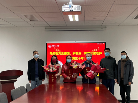 李光和代表学院向王德国、罗晓兰和郭煜老师从教满30年表示祝贺,感谢他们为专业建设和学院发展做出的突出贡献,为他们颁发了荣誉证书和鲜花,希望三位老师继续站好三尺讲台,培养更多优秀人才,为教育事业贡献力量,为青年教师树立榜样。