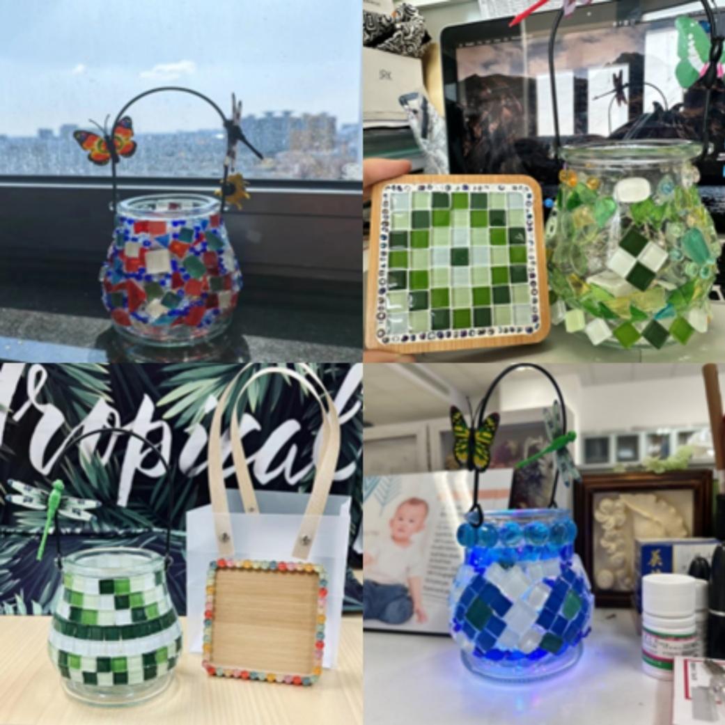 活动邀请了专业老师为大家讲解马赛克夜灯的历史渊源和制作步骤。之后,大家发挥丰富的创造力和想象力,巧思设计,悉心挑选材料,通过贴、刷、擦等动作,在玻璃瓶上认真拼贴图案,并用补缝剂填补空隙,最后用海绵沾水把多余的补缝剂擦掉,一盏盏色彩斑斓又独一无二的马赛克夜灯在大家的手中焕发光彩。制作过程中大家相互帮助,欢声笑语传遍了整个活动现场。
