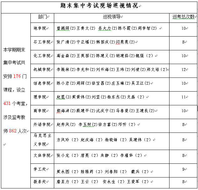 截止到2018年7月13日统计数据,集中考试期间,共有12个教学院(部)和职能部门共计55位领导干部参加了考场巡视。