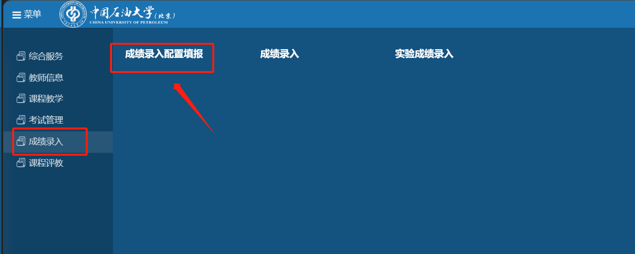 1.进入成绩录入配置填报功能后,点击课程后的“填报”按钮进行填报。若此处没有显示对应课程,请联系学院教学秘书维护课程对应的课程负责人