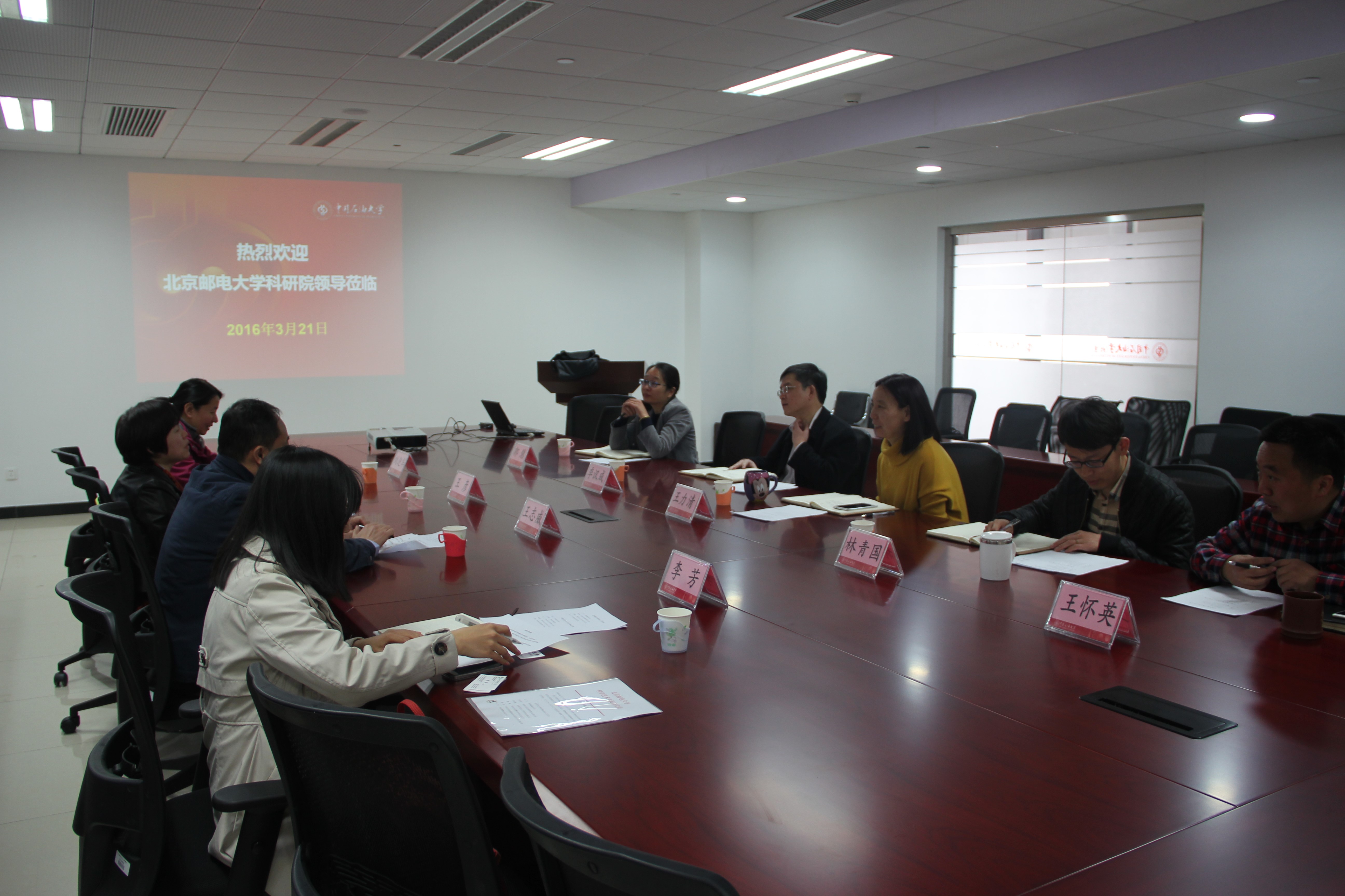 科学技术处季汉成处长首先代表学校对北京邮电大学同行的到来表示热烈欢迎,并简单介绍了学校科研管理总体情况。北京邮电大学科研院王彦处长简要介绍本次调研和交流目的,阐明了北京邮电大学科研项目和经费管理现状和困惑,希望能够学习中国石油大学有关管理工作先进经验和做法。科学技术处王力清副处长向客人详细介绍我校科研项目、外协项目和科研经费等方面管理经验和具体做法,同时还分别介绍其它如科研管理系统、与财务处等学校其他职能部门配合等客人关心的问题。会上,双方就各自管理中面临的问题和困惑进行了广泛而深入研讨和交流,互相分享了经验和做法。双方表示,希望以此次调研和交流为契机,今后继续加强合沟通联系、取长补短、共同促进学校科学研究工作更上一个新台阶。