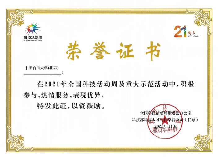 近日,全国科技活动周组委会办公室、科技部科技人才与科学普及司,表彰在2021年全国科技活动周及重大示范活动中积极参与、热情服务、表现优异的单位,中国石油大学(北京)获得表彰。这是学校继2019年之后再度获此殊荣。