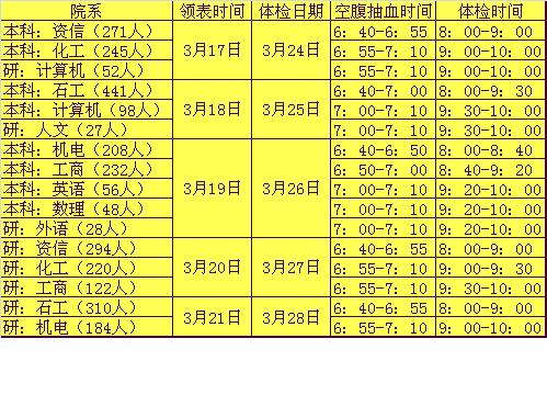体检时间定在2008年3月24日至3月28日共五天,请各班班长按照下表规定的时间到校医院防保科领取体检表并交纳体检费(每人40元,如愿意查乙肝二对半者另交28元化验费,如需检查特殊项目,请与校医院防保科联系),电话:89733082.