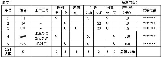 ] 体检时间:昌平全体教职工: 4月21——23日.(各单位具体体检时间待通知)。 体 检 队:协和体检队(校医院组织、协助)。 体检内容:内、外、妇、眼、耳科、B超、心电图、胸片、乳透(女性)、 化验项目:血常规、血脂、脂蛋白分类、血糖、肝功、乙肝表面抗原、 尿酸、AFP、PSA(男性)、便潜血 报名缴费时间:为便于合理安排每日体检人数和体检后体检表的分类、归档、统计及返还,请各单位(院、系、处)将届时可参检的教工(及其家属)姓名、个人电话(利于隐私保密)等信息按以下格式编汇成表,于4月10日交到校医院防保科并缴体检费。 报名格式: