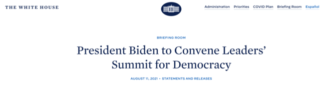 此前(8月11日),美国白宫宣布,总统拜登将于12月9日至10日主持召开第一届“民主峰会”。美国务院发言人普莱斯声称,“这一‘民主峰会’将汇集成熟的和新兴的‘民主国家’政府、公民社会和私营部门,寻求创新和大胆的承诺。”