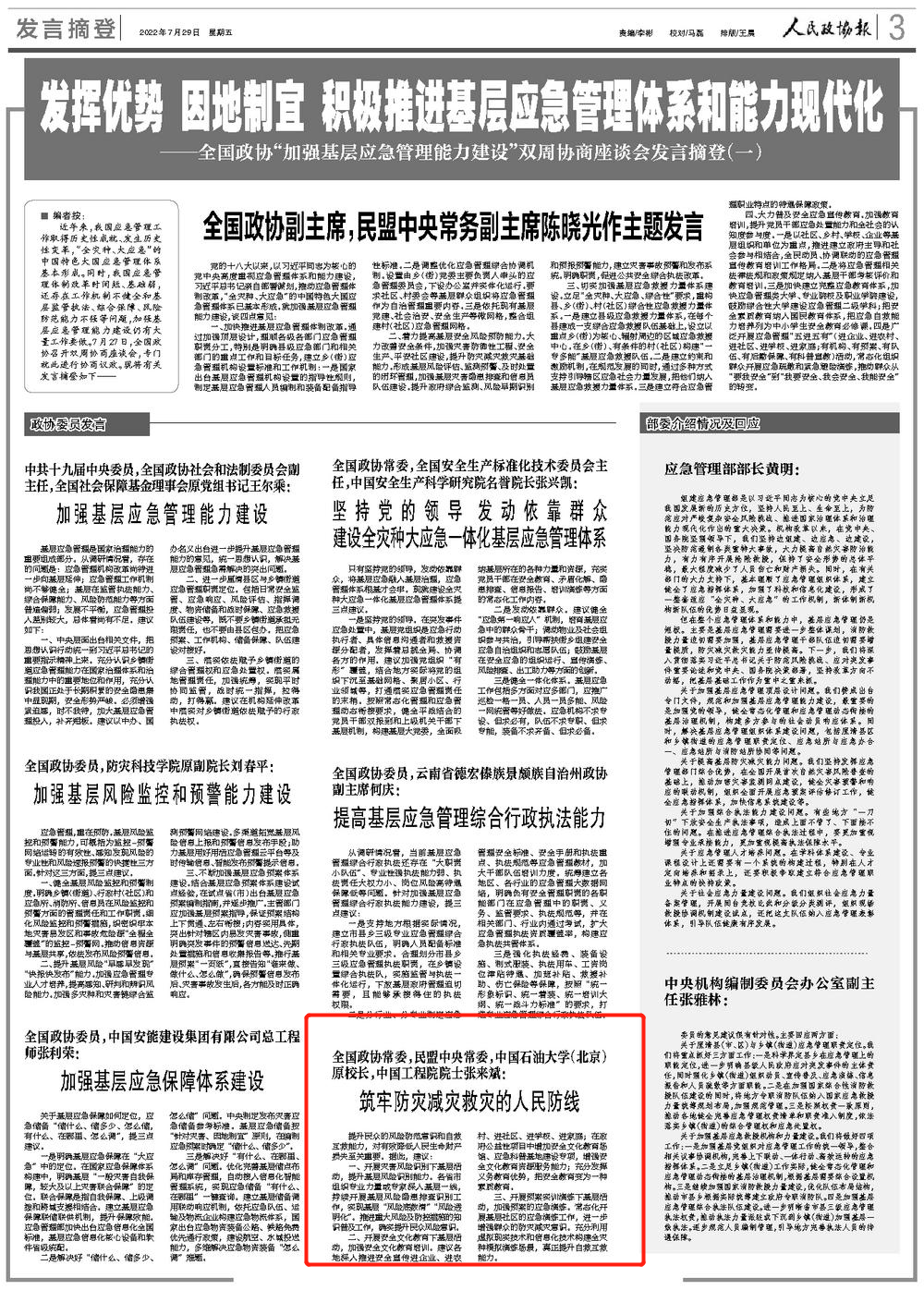 人民政协报:全国政协常委,民盟中央常委,中国石油大学(北京)原校长,中国工程院院士张来斌: 筑牢防灾减灾救灾的人民防线