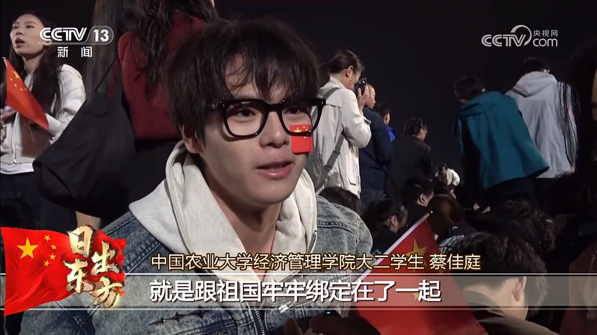 中国农业大学经济管理学院大二学生 蔡佳庭:在这里有一种归属感,没有想象中一个人、几个人在这儿等的那种寂寞。你一进入到这个广场之后,你就会感觉到,大家都拿着红旗,都朝一个地方看,感觉自己的命运和祖国牢牢绑定在了一起,让人感觉到一种深深的归属感和认同感。