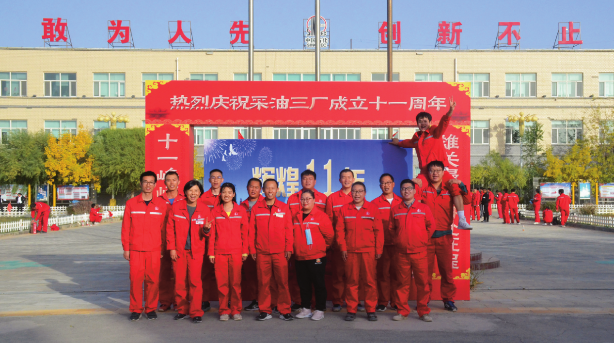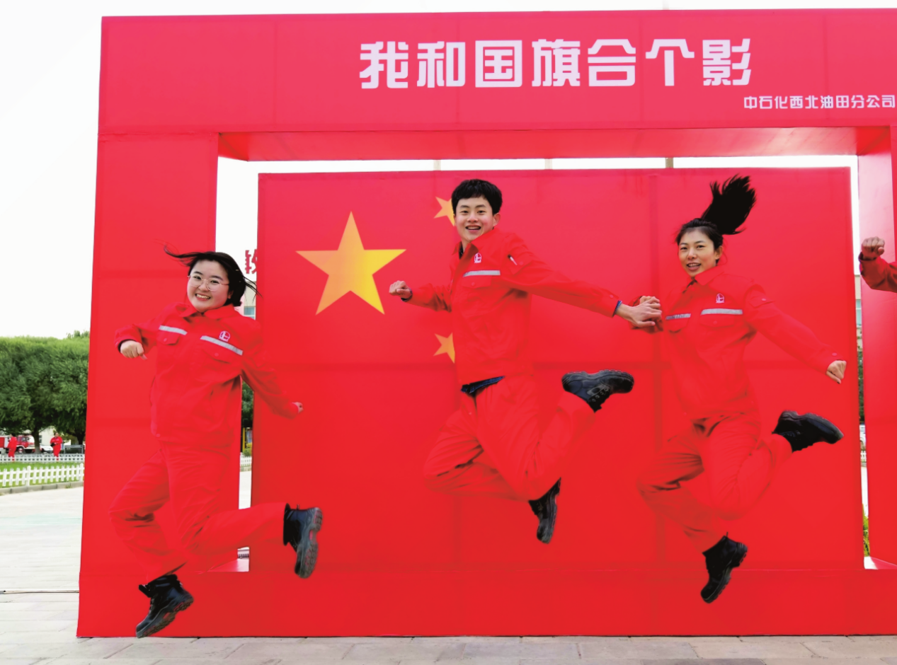 魏鹏飞(左二)与同事参加西北油田采油三厂“我和国旗合个影”活动