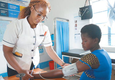 穆萨乌(左)为一名当地孕妇测量血压 本报记者 黄炜鑫摄