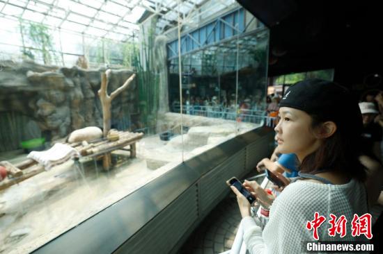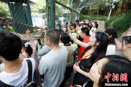 台湾青年在北京动物园熊猫馆参观。