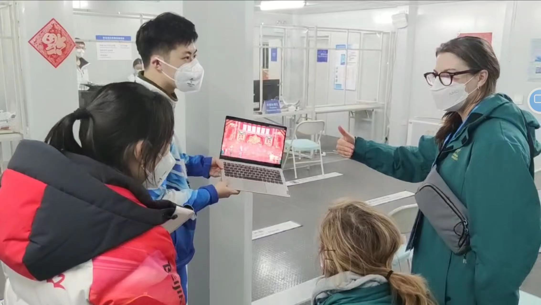 随后,其他志愿者拿起电脑走了过去,介绍起中国春节联欢晚会。外国友人饶有兴致地看着黄梅戏、传统京剧、现代京剧的联排节目,并不断提问:“这是直播吗?”“这是有故事的吗?”“这些故事有关联吗?”志愿者们一一为她们作出解答。“我们真的很喜欢中国的京剧,感谢你们送的福字,我们要把这些美丽的福字带回去!”外国友人也很激动。