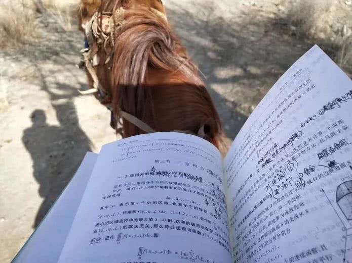 这是中国石油大学(北京)地球物理学院学生下力肯·对山汗的一张“自拍照”,照片中,他只有一个骑在马背上的影子,占了画面一半的是他的高等数学课本。