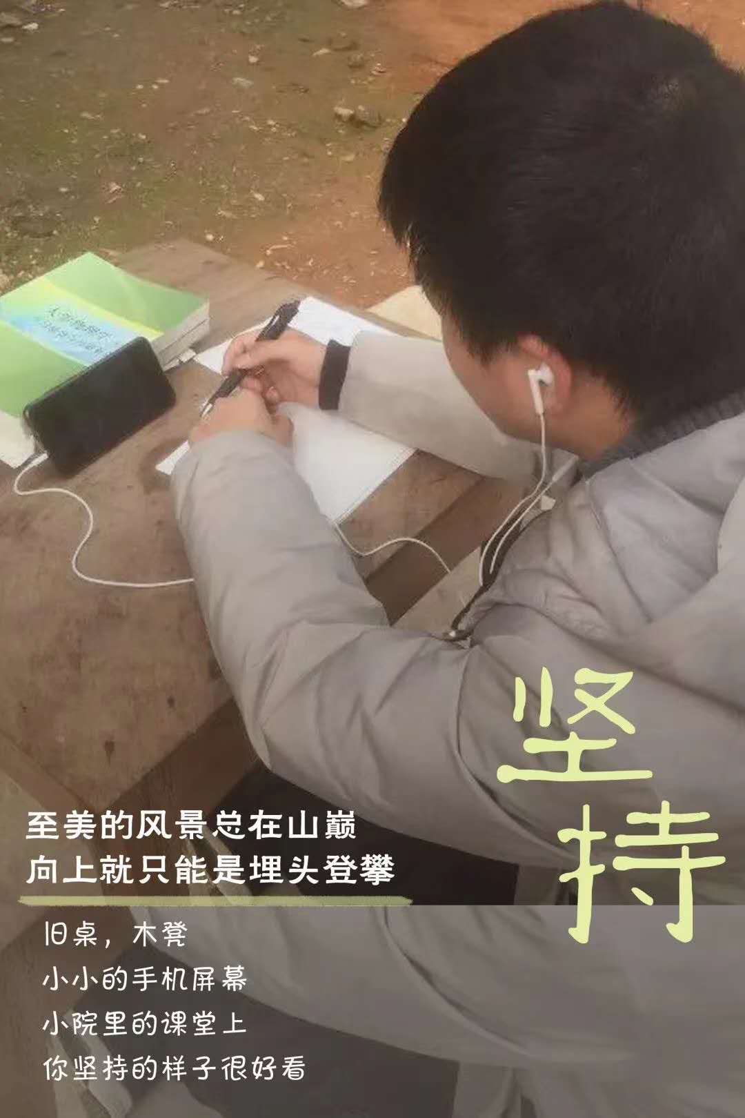 至美的风景总在山巅,向上就只能是埋头登攀,小桌、木凳,小小的手机屏幕,小院里的课堂上,你坚持的样子很好看。