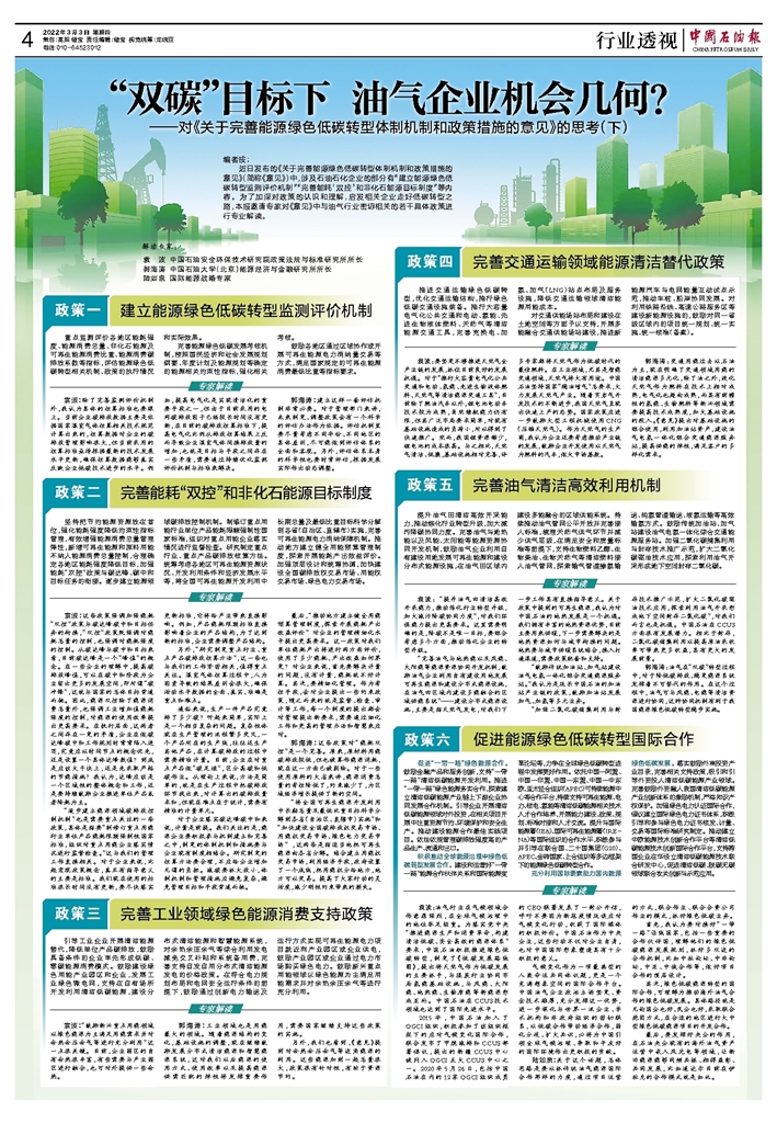 近日发布的《关于完善能源绿色低碳转型体制机制和政策措施的意见》(简称《意见》)中,涉及石油石化企业的部分有“建立能源绿色低碳转型监测评价机制”“完善能耗‘双控’和非化石能源目标制度”等内容。为了加深对政策的认识和理解,启发相关企业走好低碳转型之路,本报邀请专家对《意见》中与油气行业密切相关的若干具体政策进行专业解读。