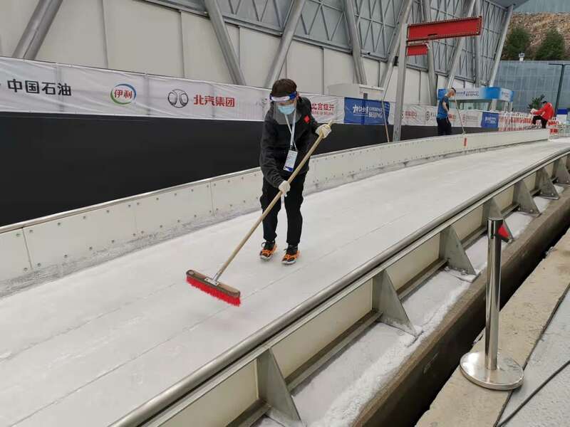 赛时,国家雪车雪橇中心将举行雪车、雪橇和钢架雪车三个项目。李少谱的岗位叫“扫冰员”,在全程1975米的赛道上服务前50-70米,清扫雪车和雪橇摩擦冰面产生的碎冰,保证下一组运动员能在平滑的冰面上出发。