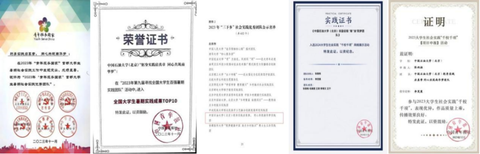 实践团队先后获评全国大学生暑期实践成果TOP10,全国大学生“三下乡”社会实践优秀团队,全国大学生社会实践成果“千校千项”优秀项目,“青年服务国家”首都大学生暑期社会实践优秀团队等。