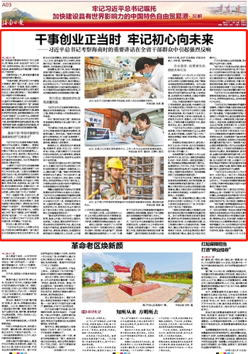 干事创业正当时,牢记初心向未来。全省干部群众纷纷表示,要深入学习习近平总书记考察海南时的重要讲话精神,在各行各业、各自岗位上努力奋斗,为建设具有世界影响力的中国特色自由贸易港作出贡献,让海南成为新时代中国改革开放的示范和展示中国风范的靓丽名片。