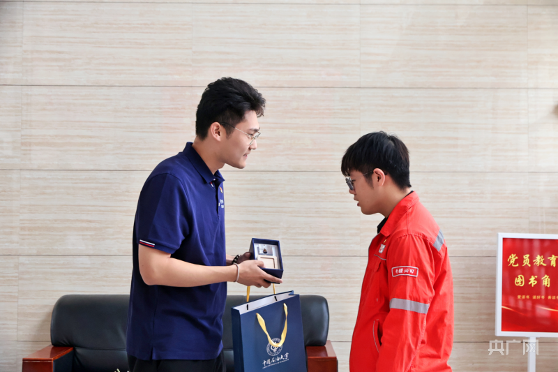 实践团员送给首届毕业生印有学校徽章的奖牌(央广网发 中国石油大学供图)