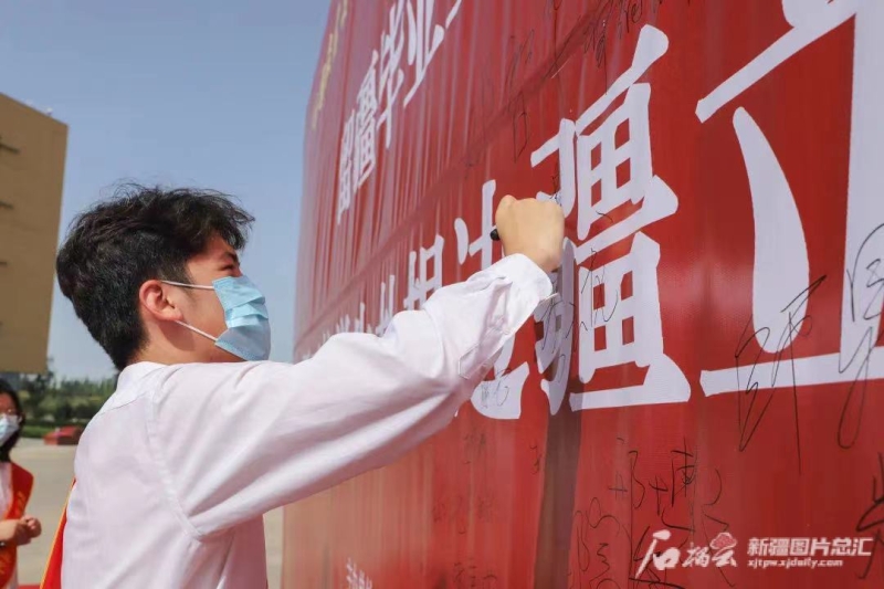 留疆毕业生出征仪式现场,毕业生代表签名,表达扎根边疆的决心。通讯员 魏静怡摄