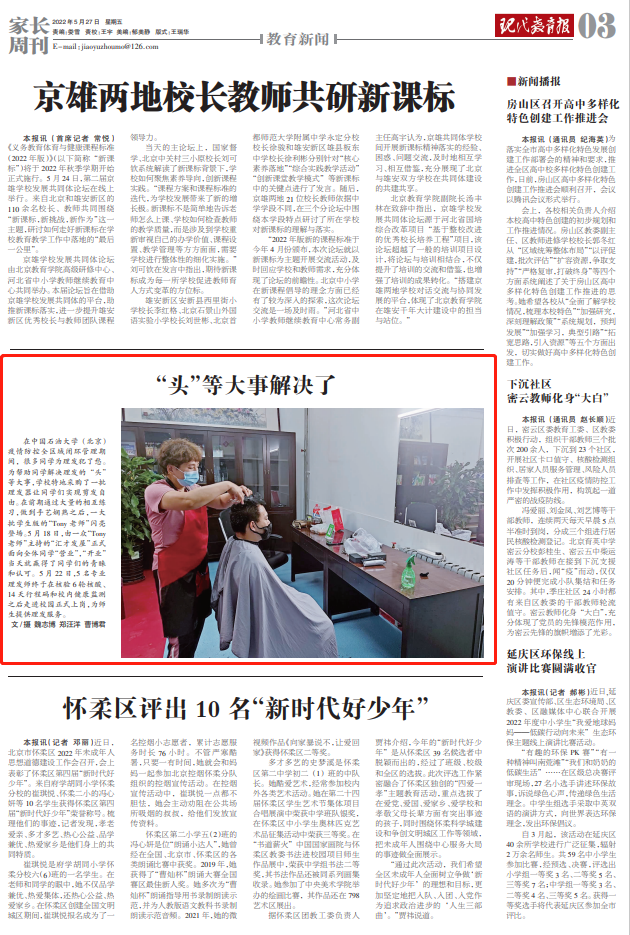 在中国石油大学(北京)疫情防控全区域闭环管理期间,很多同学为理发犯了愁。为帮助同学解决理发的“头”等大事,学校特地采购了一批理发器让同学们实现剪发自由。在前期通过大量的相互练习,做到手艺娴熟之后,一大批学生版的“Tony老师”闪亮登场。5月18日,由一众“Tony老师”主持的“汇才发屋”正式面向全体同学“营业”,“开业”当天就赢得了同学们的青睐和认可。5月22日,5名专业理发师终于在核验6轮核酸、14天行程码和校内健康监测之后走进校园正式上岗,为师生提供理发服务。