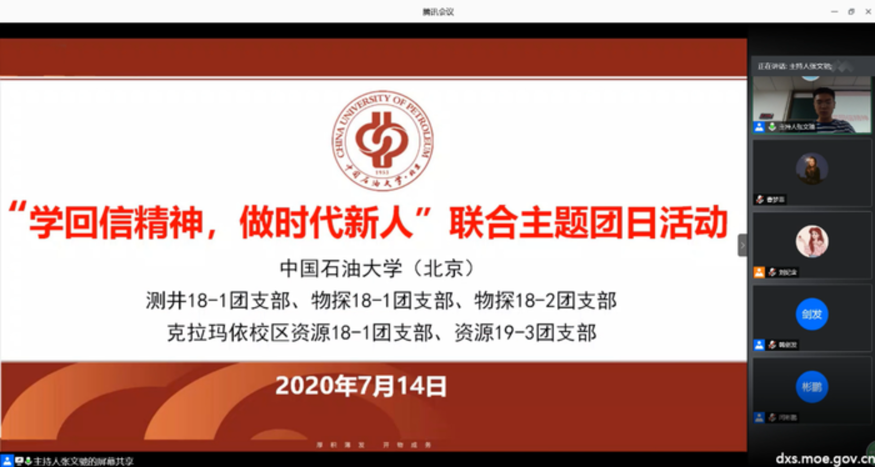 7月7日,习近平总书记给中国石油大学(北京)克拉玛依校区毕业生回信,在信中肯定了他们到边疆基层工作的选择,对广大高校毕业生提出殷切期望。为深刻学习回信精神,勇做时代新人,7月14日晚21点,中国石油大学(北京)测井18-1团支部、物探18-1团支部、物探18-2团支部与克拉玛依校区资源18-1团支部、资源19-3团支部联合开展“学回信精神,做时代新人”团日活动,共同学习习近平总书记重要回信精神。